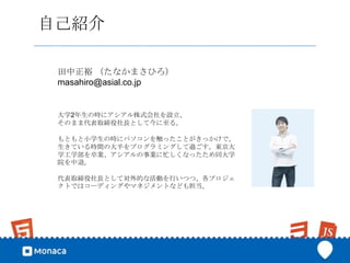 masahiro@asial.co.jp 大学2年生の時にアシアル株式会社を設立、 そのまま代表取締役社長として今に至る。 もともと小学生の時にパソコンを触ったことがきっかけで、 生きている時間の大半をプログラミングして過ごす。東京大 学工学部を卒業、アシアルの事業に忙しくなったため同大学 院を中退。 代表取締役社長として対外的な活動を行いつつ、各プロジェ クトではコーディングやマネジメントなども担当。