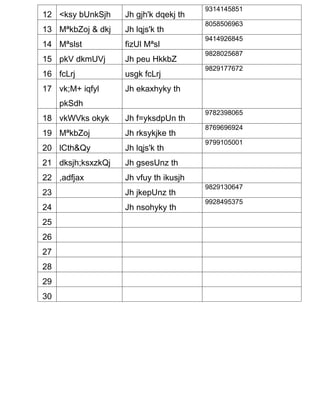 This document contains a list of 30 services/businesses and contact information for their owners/representatives. It includes names of individuals and their phone numbers organized by their service/business type. The document aims to provide a contact list of local services/businesses in the area for residents.