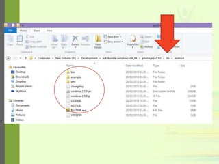 This document provides instructions for developing Android apps using PhoneGap, an open-source mobile development framework that allows building apps using HTML5, CSS3, and JavaScript. The steps include setting up the PhoneGap directory structure, copying required PhoneGap files, adding code to the Android manifest and main activity files, and then executing the PhoneGap app to display a test HTML5 form in the Android emulator browser.