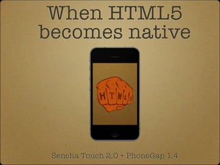 Документ описывает использование PhoneGap и Sencha Touch 2.0 для создания мобильных веб-приложений на HTML5. Основное внимание уделяется архитектуре PhoneGap, возможным командам и паттернам, а также сравнению преимуществ и недостатков веб-приложений и нативных приложений. Также упоминается простота разработки и кросс-платформенная совместимость, хотя отмечаются и ограничения в использовании API платформ и производительности.