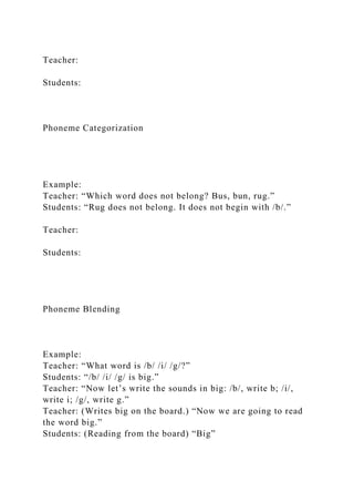 The document outlines the importance of phonemic awareness in relation to reading and spelling, providing examples of phoneme isolation, identity, categorization, blending, segmentation, deletion, addition, and substitution for educational purposes. It emphasizes the need for script preparation by educators to facilitate engaging literacy lessons while aligning with state standards. Additionally, it includes guidelines for creating a security strategy as an IT professional, detailing the development of policies, standards, and practices for a business environment.