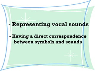 1) Phonetics represents vocal sounds with symbols that have a direct correspondence to sounds. The objective is to be able to pronounce words correctly as English spelling does not always indicate sounds.
