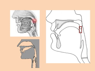This document discusses the classification of consonant sounds according to their place of articulation in the vocal tract. It explains that consonants are sounds produced with some restriction of airflow, as opposed to vowels. The main places of articulation described are bilabial, labiodental, interdental, alveolar, palatal, velar, uvular, and glottal sounds. Each place is defined by where in the mouth the air flow is obstructed, such as with the lips or tongue touching different areas like the teeth, hard palate, soft palate or uvula.