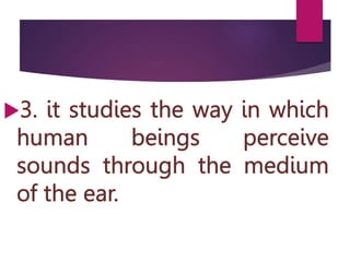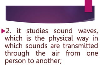 This document provides definitions of phonetics from multiple sources. Phonetics is summarized as the scientific study of human speech sounds, including their articulation, acoustic properties, perception, production, transmission and reception. Phonetics analyzes and describes speech sounds and provides means for classifying sounds produced by the human vocal tract.