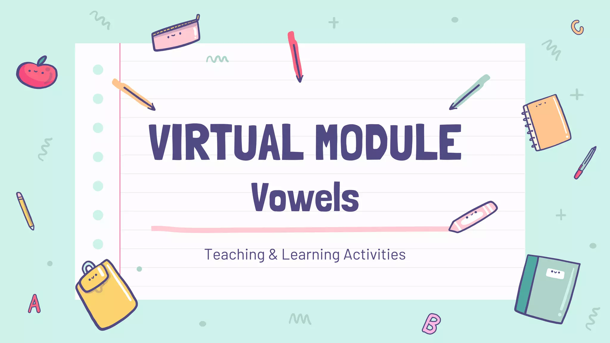 This virtual module provides teaching materials on vowels for phonetic and phonology classes. It includes introductions to short and long vowels in English, exercises to practice pronunciation, and a game to reinforce learning. The module aims to help students improve pronunciation, speak confidently, and enhance understanding of vowels in a fun way. Upon completing the module, students will be able to explain and correctly pronounce short and long vowels and identify their positions.