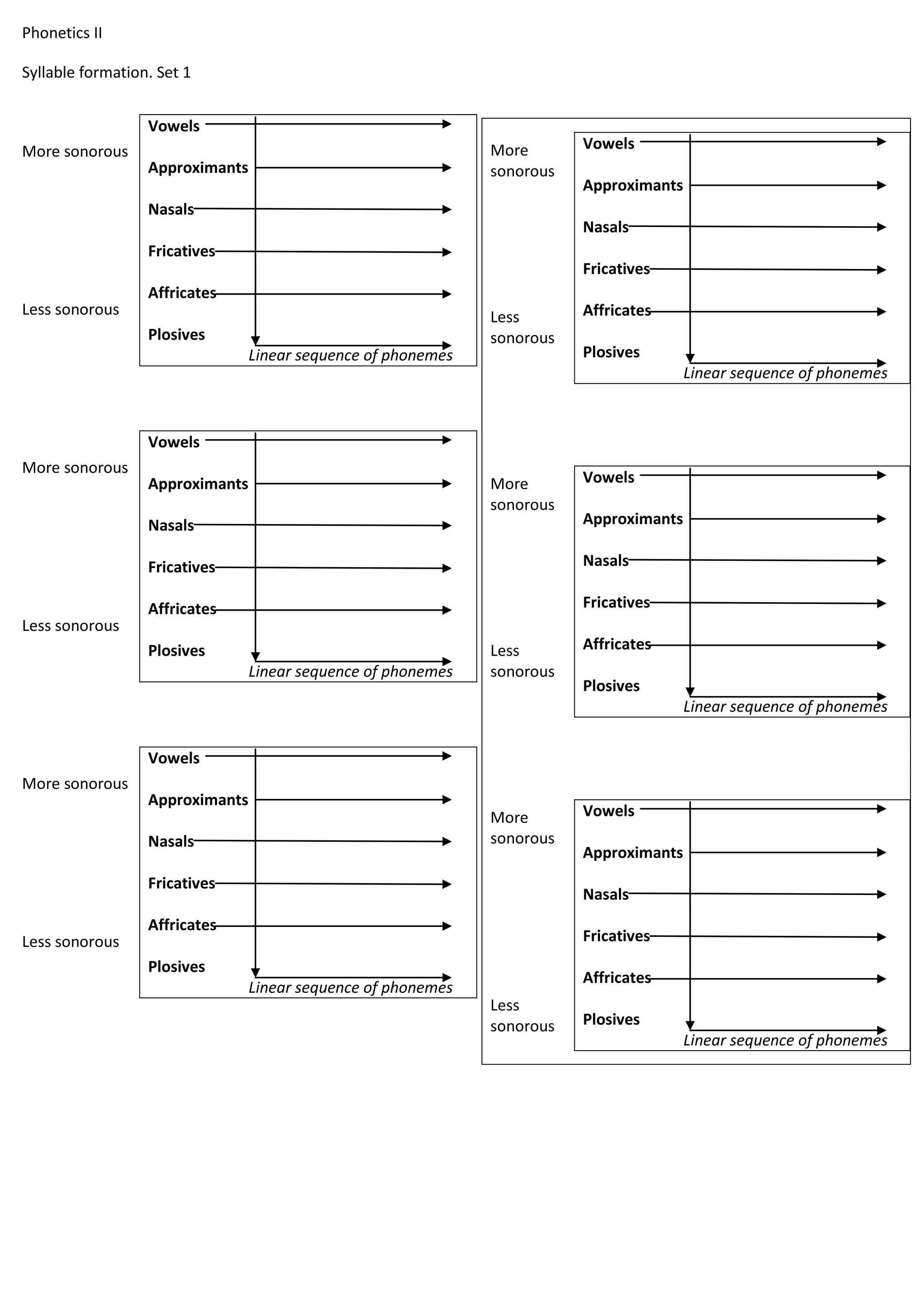 This document discusses syllable formation and presents three charts that order consonants and vowels from most sonorous to least sonorous. Vowels and approximants are the most sonorous sounds, followed by nasals, fricatives, affricates, and plosives are the least sonorous. The charts illustrate the linear sequence of phonemes that make up syllables from most to least sonorous.
