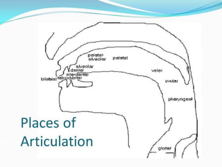 The document discusses the classification of consonants according to their manner and place of articulation in English. It describes the key articulators involved in producing different consonant sounds and lists examples for each major manner and place category. The main manners described are plosives, affricates, fricatives, nasals, laterals, trills, and semi-vowels. The major place categories outlined are bilabial, labiodental, dental, alveolar, palato-alveolar, palatal, velar, and glottal. A table provides examples of consonants classified by both manner and place of articulation.