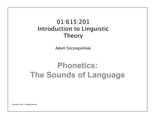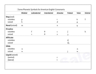 This document provides an overview of phonetics, the study of speech sounds. It discusses how sounds are segmented in speech and the goals of the different subfields of phonetics. Key points covered include the classification of consonant sounds based on their place and manner of articulation, as well as an introduction to the International Phonetic Alphabet used to represent sounds. The articulatory processes used to produce different consonant types such as stops, fricatives, and approximants are also summarized.