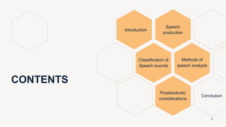 This document discusses phonetics and speech production as it relates to prosthodontic considerations. It covers topics such as the classification of speech sounds, methods of speech analysis, and how to position teeth during denture fabrication to facilitate proper speech. The production of specific sounds like 's' and 'f' are examined in detail. The document emphasizes that the dentist should understand speech mechanics to avoid creating speech difficulties when providing dental treatments like complete dentures.