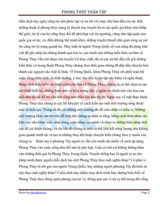 Phong thủy là một hệ thống khoa học về môi trường sống với nguồn gốc từ triết lý tự nhiên của người Trung Quốc, nhằm cân bằng cuộc sống con người với môi trường. Cuốn sách trình bày các khái niệm và ứng dụng phong thủy trong đời sống hiện đại, giúp cải thiện không gian sống và làm việc để duy trì sức khỏe và hạnh phúc. Những nguyên lý phong thủy linh hoạt có thể áp dụng trong mọi nền văn hóa và tôn giáo, góp phần tạo ra cuộc sống hài hòa và bền vững.