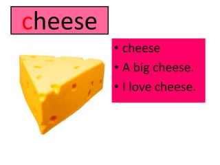 The document contains short descriptions of various nouns, including types of food (cheese, cake, carrot), animals (camel, cow, duck, elephant), clothing (cap), objects (clock, key, lock, sack, ticket, rocket, peg), actions (walking, kissing, selling, telling), colors (black, yellow), and more. Each entry consists of the noun and a 1-2 sentence description.
