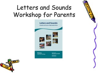 This document summarizes a workshop for parents on teaching phonics. It explains that phonics involves teaching the sounds that make up words as a code for reading and writing. The workshop covers the progression through six phases of phonics instruction, from basic sound recognition to spelling rules. It provides examples of phonics elements like graphemes, phonemes, blending and segmenting. The goal is for parents to understand how phonics is taught so they can support their children's learning at home through games and activities involving letters, sounds and reading.