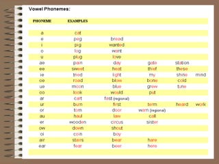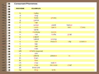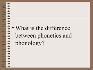 Phonology is the study of how sounds are organized and used in languages. It involves identifying the phonemes, or smallest units of sound, that make up words, and describing how combinations of phonemes are used to create meaning. Phonology also examines phonological processes like allophones, which are variations in pronunciation of the same phoneme, and rules that govern how phonemes are combined into syllables and words with correct stress patterns. The international phonetic alphabet is used to represent sounds in a standardized way across languages.