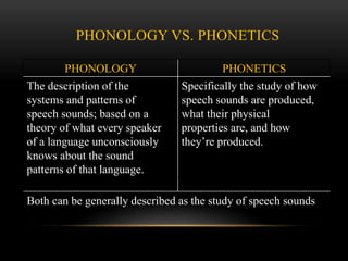 This document discusses phonology and phonetics. Phonology is the study of sound patterns in language, while phonetics is the physical properties and production of speech sounds. A phoneme is a meaningful sound unit in a language, represented between slashes. An allophone is a phonetic realization of a phoneme. For example, the 'p' sound in 'paper' and 'spill' are allophones of the phoneme /p/ in English. Phonemes contrast meaning between words, like 'rowing' vs. 'mowing', while allophones do not change meaning. The minimal pairs test examines if two sounds can change the meaning of words when swapped, like "take" vs. "tape".
