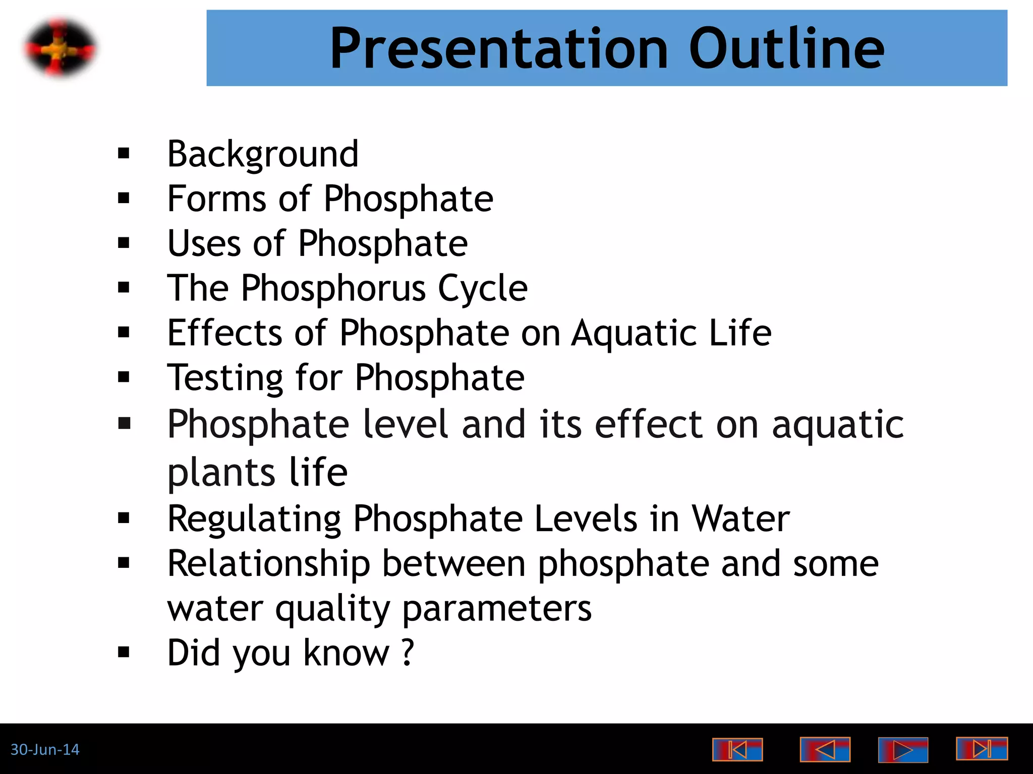 The document discusses the role of phosphates as a water quality parameter, highlighting their forms, uses, and effects on aquatic life along with the testing and regulation of phosphate levels. It emphasizes the importance of phosphates for plant growth, discusses issues like eutrophication due to excess phosphates, and provides information on methods to test and regulate phosphate levels in water. Additionally, it briefly mentions historical facts and influences of phosphates on various water quality parameters.