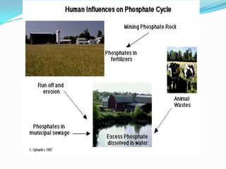 The phosphorus cycle involves the movement of phosphorus through the environment and living organisms. Phosphorus moves slowly through soils and oceans but cycles more quickly through ecosystems as it is absorbed by plants and animals and returned to soils through decomposition. Humans have significantly impacted the phosphorus cycle through mining phosphorus ores, use of phosphorus fertilizers, and transporting phosphorus-containing food and waste. This risks over-enrichment of waters with phosphorus from runoff and effluent, contributing to accelerated eutrophication of water bodies.