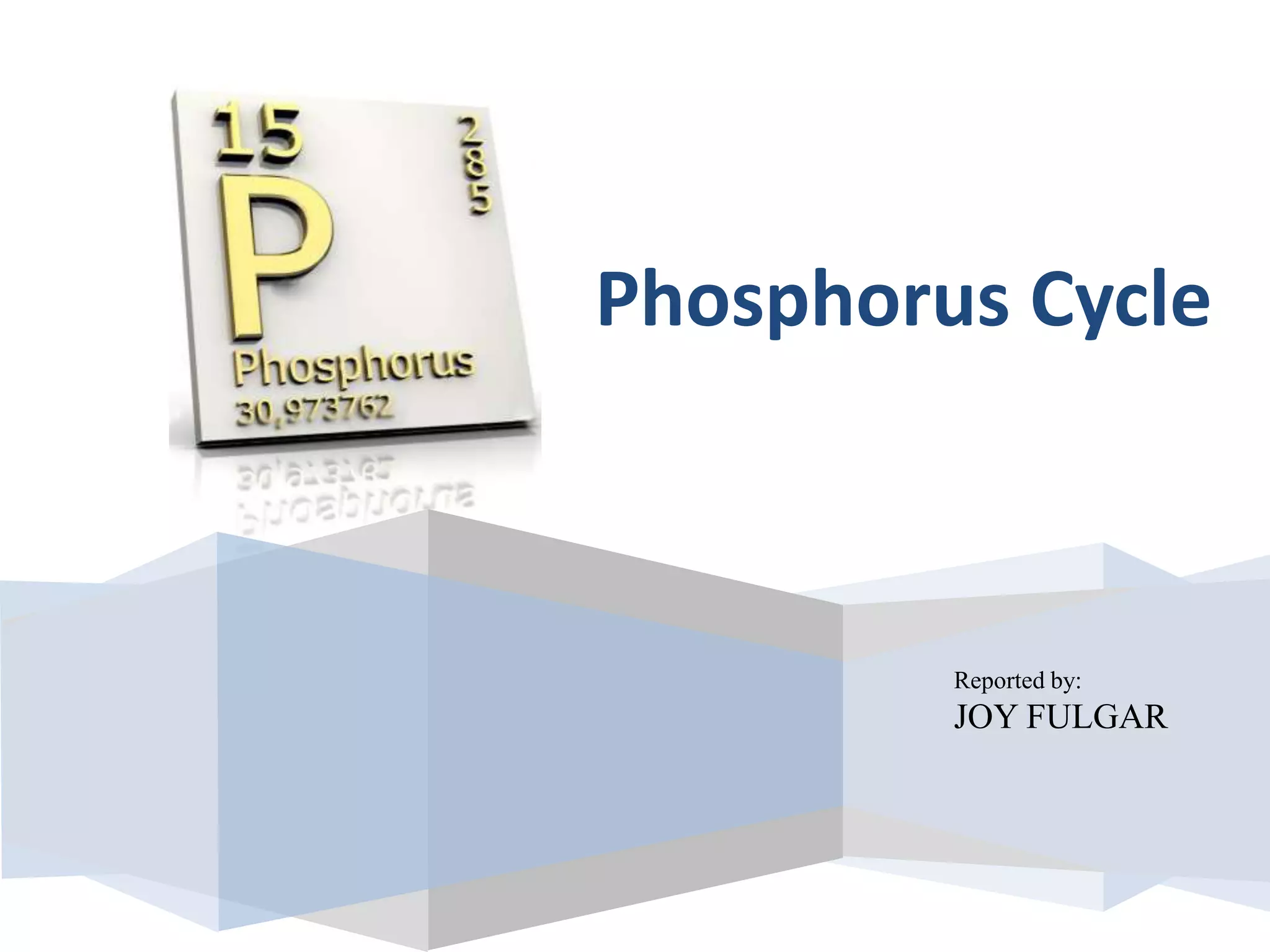 Phosphorus was discovered in 1669 by Hennig Brand in Germany. It exists naturally as phosphate minerals in the earth's crust and is essential for all life as a component of DNA, RNA, ATP, and bones. Phosphorus cycles through the lithosphere, hydrosphere, and biosphere as it weathers from rocks into soil and water, is absorbed by plants and animals, and returns to the environment through decomposition. Human activities like phosphate fertilizer production and forest clearing have disrupted the natural phosphorus cycle.