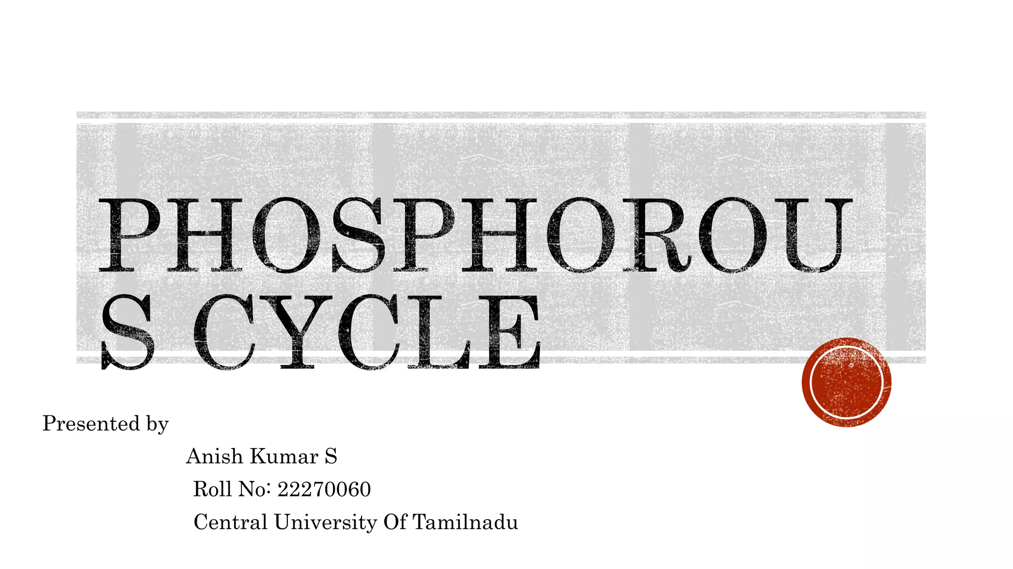 The document discusses the phosphorus cycle, which is essential for life. Phosphorus is limiting in many ecosystems and its cycle involves geological processes that move it between rocks, soil, organisms and ocean sediments over long timescales. The cycle has been impacted by human activities like mining, fertilizer use and transport, which are increasing phosphorus levels in waterways and causing eutrophication. This disrupts ecosystems and leads to issues like dead zones lacking in oxygen. Effectively managing phosphorus and reducing runoff can help address these problems.