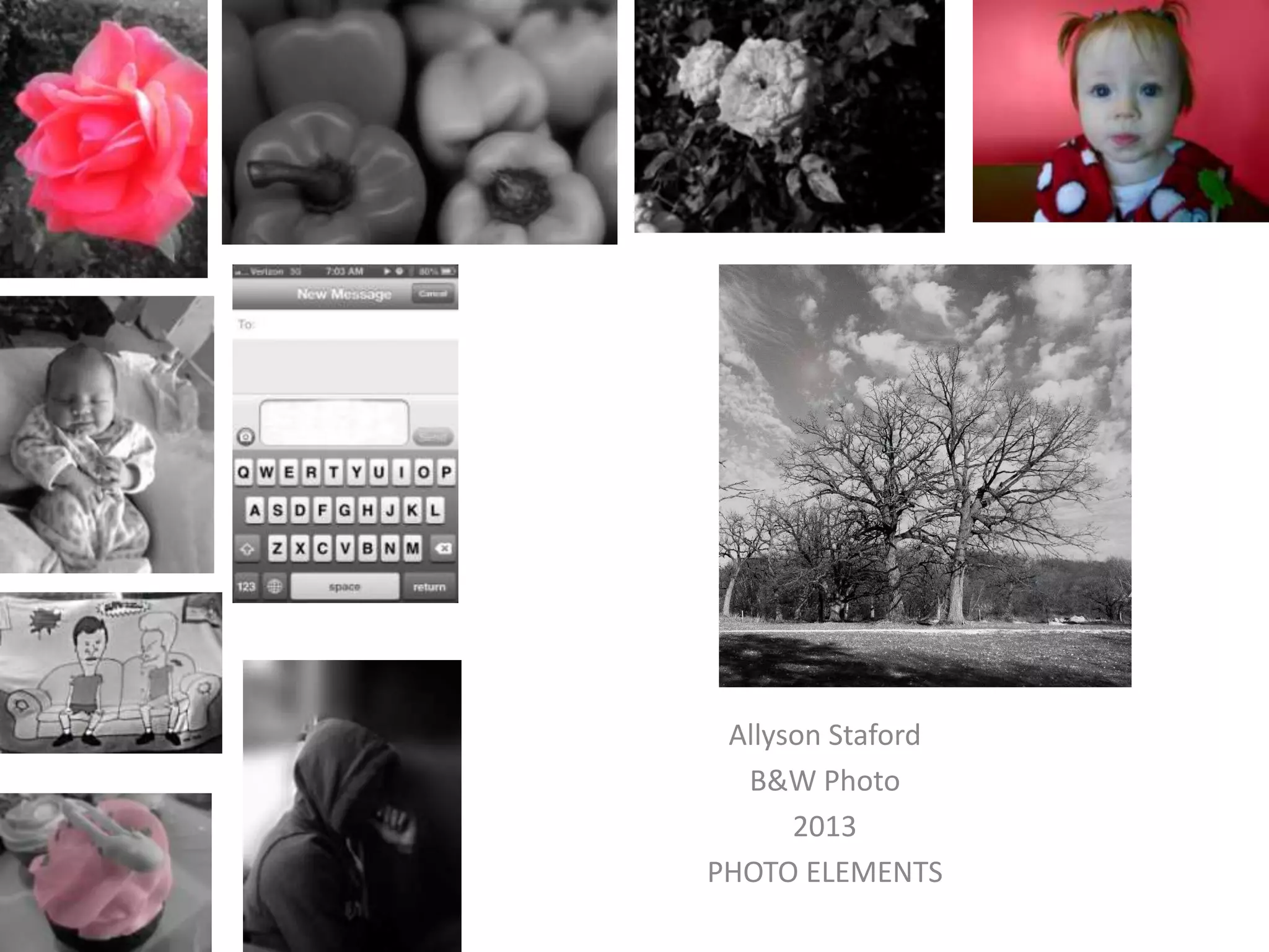 The document appears to be a collection of photo titles and descriptions created by Allyson Staford in 2013. Most of the photos are labeled as black and white, though some include joking additional descriptions. The photos cover a range of subjects from cupcakes to trees to inside jokes and references.