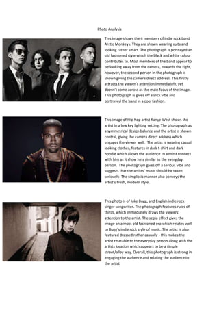 This document analyzes and summarizes several photographs of famous musicians. The first photograph shows the indie rock band Arctic Monkeys in black and white suits, giving off a slick, cool vibe. The second is of Kanye West in casual clothes against a low-key background, showing his serious yet relatable style. The third features Jake Bugg using rules of thirds to draw attention to the indie singer-songwriter in a sepia tone, relating to his music.