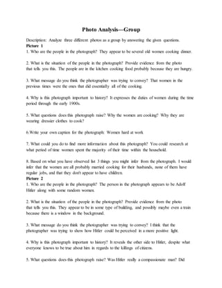 The document describes a photo analysis activity where students analyze 6 historical photographs in groups by answering questions about the subjects, context, and meaning of each photo. The photos depict: 1) women cooking in the early 1900s, 2) Adolf Hitler with women, 3) African Americans and police officers, 4) a man hanging from the Statue of Liberty, 5) immigrants arriving at Ellis Island, and 6) men enlisting in the military.