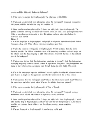 The document describes a photo analysis activity where students analyze 6 historical photographs in groups by answering questions about the subjects, context, and meaning of each photo. The photos depict: 1) women cooking in the early 1900s, 2) Adolf Hitler with women, 3) African Americans and police officers, 4) a man hanging from the Statue of Liberty, 5) immigrants arriving at Ellis Island, and 6) men enlisting in the military.