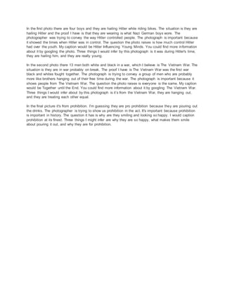 The document summarizes and analyzes three historical photographs. The first photo shows four German boys hailing Hitler on bicycles during Nazi rule, intended to show Hitler's control over youth. The second photo depicts 13 men, both black and white, resting during the Vietnam War, intended to convey camaraderie between soldiers of different races. The third photo from Prohibition shows smiling people pouring out drinks to enforce the ban, raising questions about why they seemed happy to destroy alcohol.