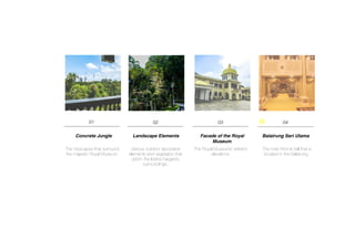 The document provides a photo book tour of the Royal Museum located within the Istana Negara. It includes photos and descriptions of the museum's exterior, main throne hall, connecting corridors, king and queen's bedrooms and washrooms, stairs, decorative elements, and chandeliers. The style is a mix of British colonial, Victorian, and modern elements that create an opulent but modest atmosphere befitting a royal palace.