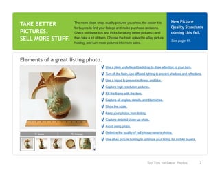 1. The document provides tips for taking great photos to sell items more effectively on eBay. It recommends using diffused lighting without shadows, a plain backdrop, and a tripod to prevent blurry photos. It also stresses filling the frame with the item, showing details and scale, and high resolution.