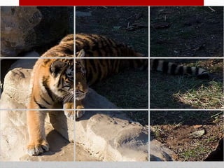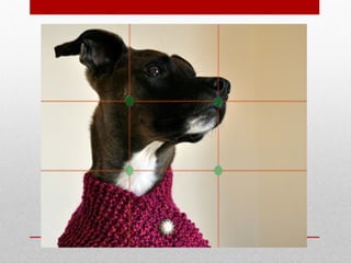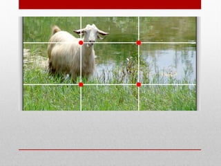 This document discusses several rules of photo composition, including the rule of thirds, leading lines, symmetry and patterns, foreground/middle/background separation, and framing. The rule of thirds involves dividing the frame into nine equal sections using horizontal and vertical lines to place subjects. Leading lines use lines in the photo to guide the viewer's eye. Symmetry and patterns center the focus, while separating foreground, middle and background elements avoids clutter. Effective framing emphasizes the subject within symmetrical or patterned backgrounds. Following these composition rules can improve photos by making certain elements stand out.