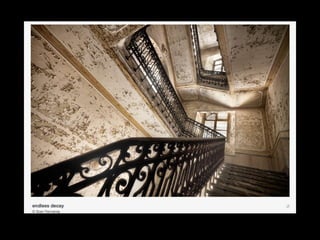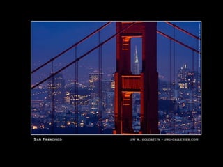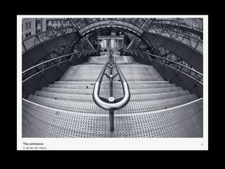 The document discusses various photographic elements that impact the design of an image, including focus, depth of field, optics, exposure, and movement. It explains that focus draws the viewer's attention and is a choice of what to emphasize. Wide angle lenses provide depth perception while telephoto lenses compress space. Exposure impacts brightness and contrast, and flare, glare, and silhouettes are lighting techniques. Motion and the decisive moment of anticipation are also addressed.