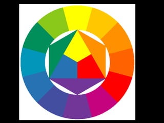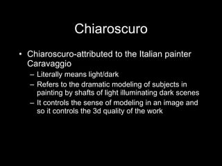 Chiaroscuro refers to the use of strong contrasts between light and dark to create a three-dimensional effect. It was pioneered by the painter Caravaggio and involves illuminating dark scenes with shafts of light. The level of light or darkness used in an image, whether it favors shadows or highlights, can dictate the mood conveyed as either low key or high key. Color plays an important role in composition, with hue, saturation, and brightness determining each color, and relationships between different colors like complements and harmonies evoking emotional responses.
