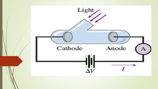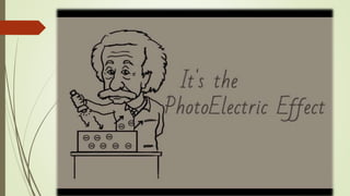 This document summarizes the photoelectric effect. It begins by discussing Hertz's observation that sparks occurred more readily when ultraviolet light was directed onto a light ball. Einstein later proposed that light is made up of discrete packets of energy called photons. The energy of a photon is given by E=hν, where h is Planck's constant and ν is the photon's frequency. When photons of sufficiently high frequency strike a metal surface, they can eject electrons from the metal in what is called the photoelectric effect. The document describes the experimental setup used to study the effect and provides the mathematical description relating the maximum kinetic energy of ejected electrons to the photon frequency and the metal's work function.