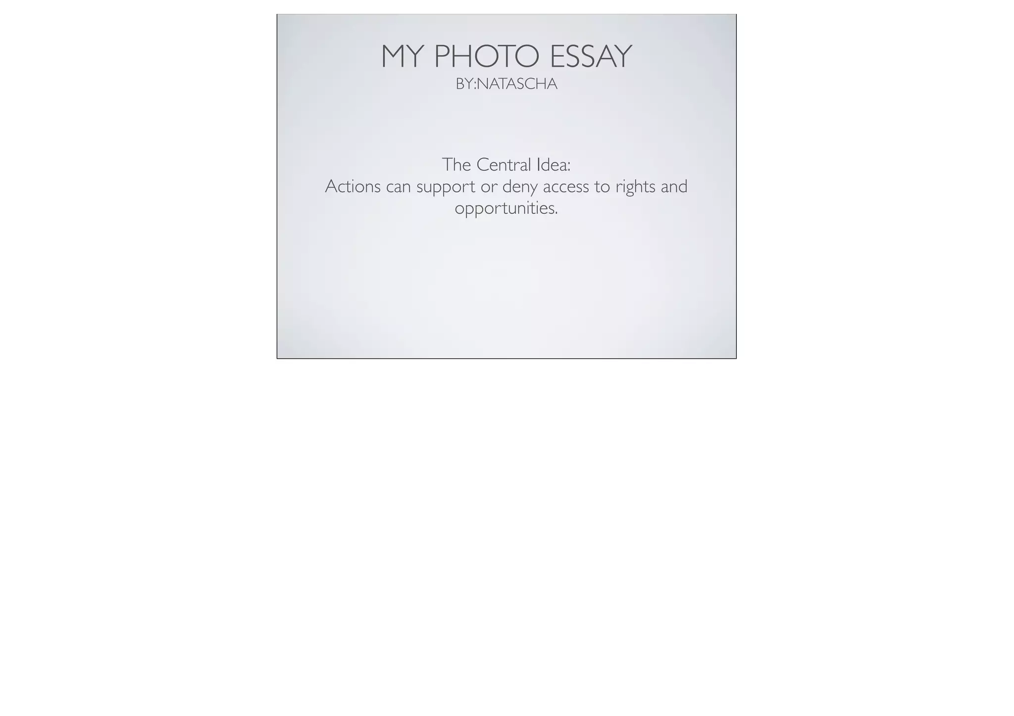 Natasha's photo essay discusses how actions can either support or deny people's rights and opportunities. The essay provides three examples to prove this central idea: (1) the story of Iqbal, a boy who escaped child labor and helped shut down the carpet factory, supporting children's rights; (2) the story of Megan Meier, who committed suicide after being cyberbullied, denying her upcoming rights and opportunities; and (3) the work of Unicef to help kids in poverty around the world and support their right to live.