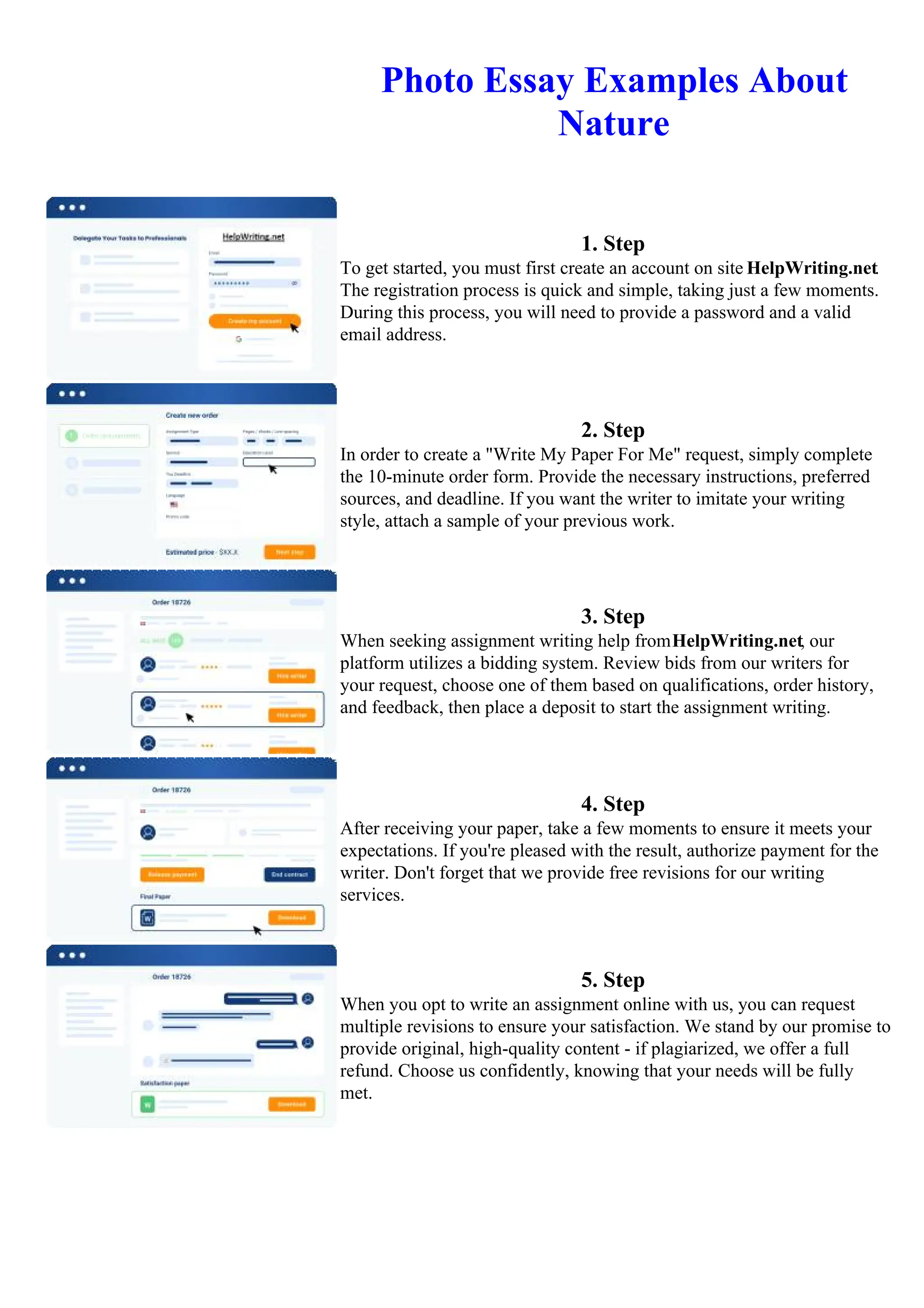 The document provides instructions for requesting and completing an assignment writing request on the HelpWriting.net website. It outlines a 5-step process: 1) Create an account; 2) Complete an order form with instructions and deadline; 3) Review bids from writers and select one; 4) Review the completed paper; 5) Request revisions if needed, with HelpWriting.net providing original, high-quality content or a full refund.