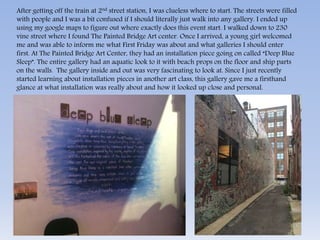 - The author shares their experience visiting multiple galleries, including The Painted Bridge Art Center which had an aquatic-themed installation, and The Center for Art in Wood showcasing works made of wood.