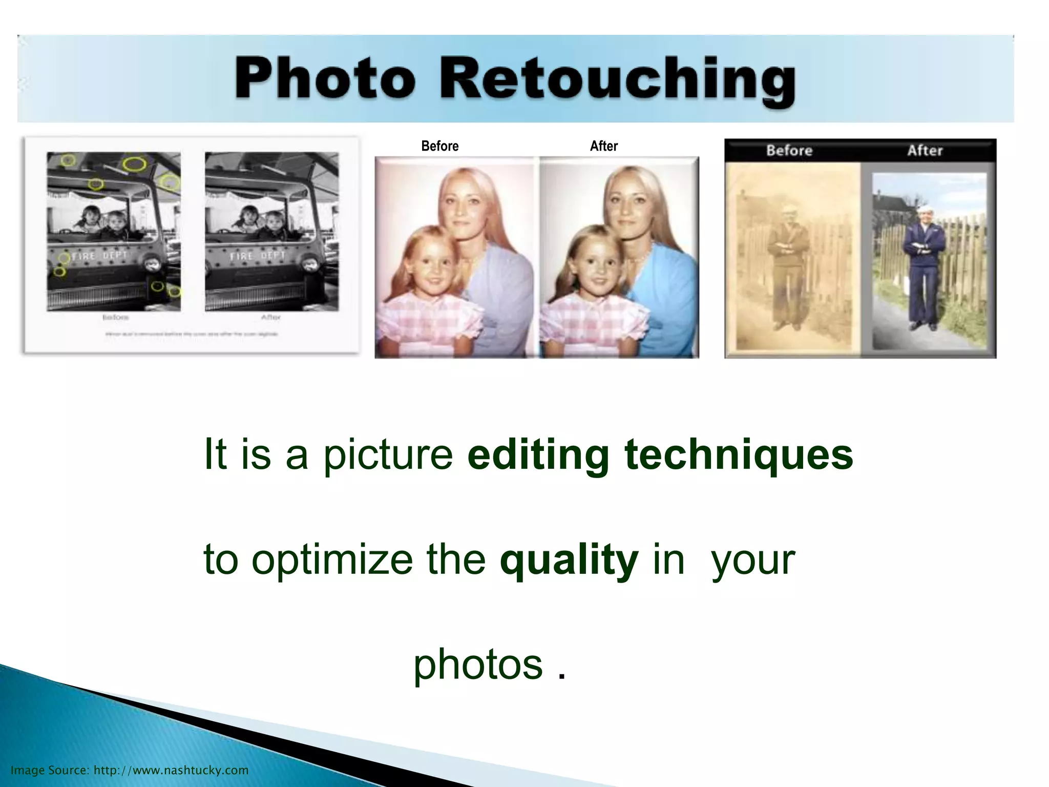 Photo retouching is an image editing technique used to optimize photo quality. It is commonly used in media like magazines and newspapers to modify and improve photos for storytelling purposes. Photo retouching services can restore photos that may be faded, out of balance, or imperfect to look almost new through techniques like color correction, contrast adjustment, detail enhancement, and blemish removal.