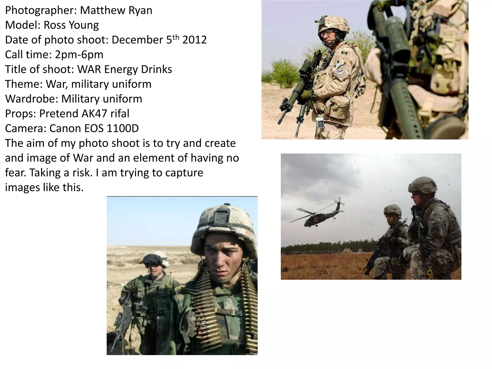 The photographer Matthew Ryan held a photo shoot on December 5th 2012 from 2pm-6pm titled "WAR Energy Drinks". The theme was war and the military, with the model Ross Young wearing a military uniform and holding a pretend AK47 rifle. The photographer aimed to create images conveying war and risk-taking with no fear.