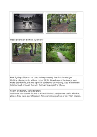 The photographer will take photos of college students holding props like guitars and microphones to portray a music theme. Half the photos will be taken outside to use natural light and backgrounds, while studio photos of people for the cover will have a plain white background. Ten final photos will be selected after reviewing both outdoor and indoor shots. The photo shoot will take place on February 4th at 11am outdoors and in a studio, using casual clothing, music props, and techniques like depth of field and rules of thirds. Health and safety precautions will be made for outdoor locations.