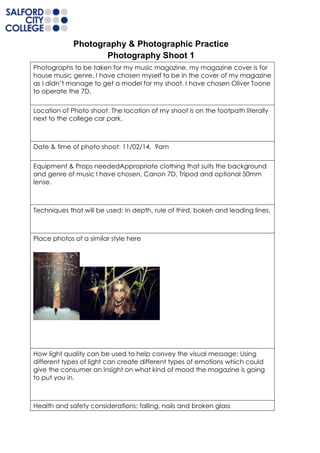 The document outlines a photography shoot for a music magazine cover featuring house music. The photographer will be the subject as no model could be secured. The shoot will take place on February 11th at 9am next to the college car park using a Canon 7D camera, tripod, and optional lens. Composition techniques like rule of thirds, depth of field, bokeh and leading lines will be employed. Different lighting can convey different moods to give insight into the magazine's tone. Health and safety risks include falling, nails, and broken glass.