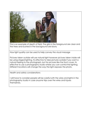 This photography shoot will take place on February 18th, 2014 at 9am to take photos of a girl for an indie music magazine. Photos will be taken around campus and in a photography studio using props like a guitar and sunglasses. Indoor studio photos aim for a plain white background to make the subject stand out, while outdoor photos will use natural light. Equipment needed includes casual clothing and props, and techniques like depth of field will be experimented with.