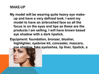 The document provides details for a makeup model photoshoot, including heavy eye makeup, airbrushed skin, brown eyeshadow and dark lipstick. The model will wear a black top and leather jacket with hair down and pushed back to highlight facial features. Soft, even lighting will showcase the makeup and definition will be added using shadows. Close-up shots of the model's face will focus on the makeup products being sold. Equipment includes makeup, hair, lighting and camera items.