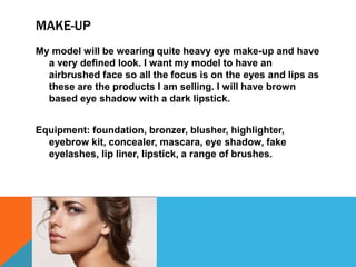 The document outlines plans for a makeup look featuring heavy eye makeup and dark lipstick with an airbrushed face. Equipment listed includes various makeup products as well as brushes. The model will wear a black top and leather jacket with hair down and wavy. Lighting will use soft, even colored lights and shadows to showcase the makeup. Shots will be close-up medium shots of the model's face, using a telephoto lens.