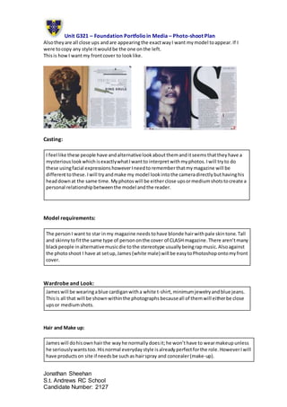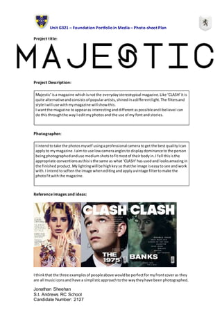 This document outlines Jonathan Sheehan's plans for a photo shoot to create images for the front cover and feature article of an alternative music magazine called "Majestic." The photos will be taken of a male model, James, who has the look and style that fits the magazine's aesthetic. Jonathan plans to take photos outdoors at two locations in autumn light for their vintage quality. He will use a professional camera and stylistic editing techniques to capture images of James in close-ups and medium shots that portray an alternative, mysterious style fitting for the magazine.