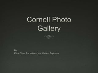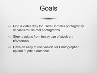 The document outlines goals and future plans for Cornell's photography services which include finding a way for users to use real photographs instead of stock photos, providing guidelines for photographing microscopes and portraits, establishing fees and consent forms, and exploring new image gallery platforms that allow easy uploading and display of photographs. Issues to discuss include ownership of images and obtaining approval for photographs taken in public areas.