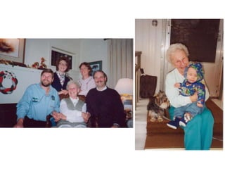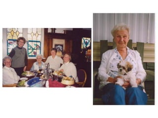 Louise Margaret Jennings, nee Crookes, lived from 1918 to 1921 in Irvine, Alberta with her parents James and Rose Crookes. From 1921 to 1926, she lived with her family in Fort Steele, British Columbia, along with her sister Eleanor. Louise had a long life surrounded by family and friends, spending time with her sister, children, grandchildren, and great-grandchildren. She enjoyed family time at the cabin, playing games with her husband Doug, and celebrating milestones like her 75th birthday and turning 90 years old.