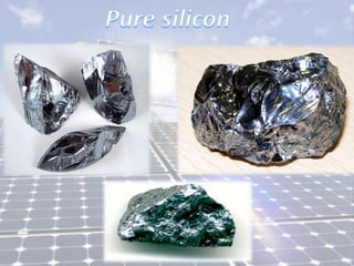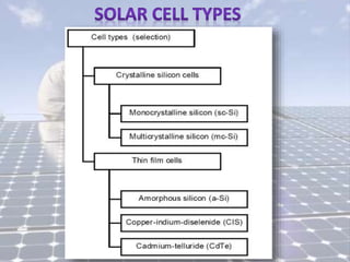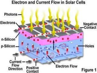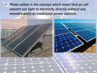 PV cells convert sunlight directly into electricity without moving parts. PV systems can be installed on rooftops and other structures. The sun is a nuclear fusion reactor that provides radiation energy, with only a small proportion reaching Earth's surface. Traditional energy sources like gas, oil and coal are finite, while sunlight reaching Earth could meet energy needs with only 0.01% utilization. PV cell performance is affected by factors like temperature, shading, and irradiance level, with output decreasing at higher temperatures. Different cell types have varying efficiencies depending on material used.