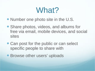 Photobucket is the number one photo sharing site in the U.S., allowing users to share photos, videos, and albums for free via email, mobile devices, and social media. Founded in 2003, it has grown to over 99 million users, most of whom are 15-40 years old. Photobucket offers features like photo organization, editing tools, and integration with social networks to make sharing easy. While primarily used by individuals, organizations and businesses also utilize Photobucket to promote themselves, fundraise, and engage with online audiences.