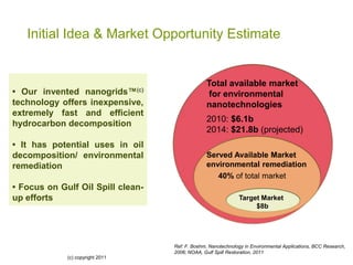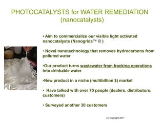 This document summarizes a company's photocatalyst nanotechnology product for water remediation.