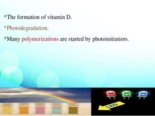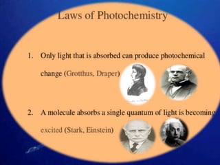 This document provides an overview of the topic of photochemistry. It discusses key concepts like quantum yield, which is a measure of reaction efficiency, and how it is experimentally determined. Diagrams like the Jablonski diagram are also mentioned. Specific photochemical processes covered include fluorescence, phosphorescence, chemiluminescence, and bioluminescence. Finally, some applications of photochemistry are listed, along with a bibliography for further reading.